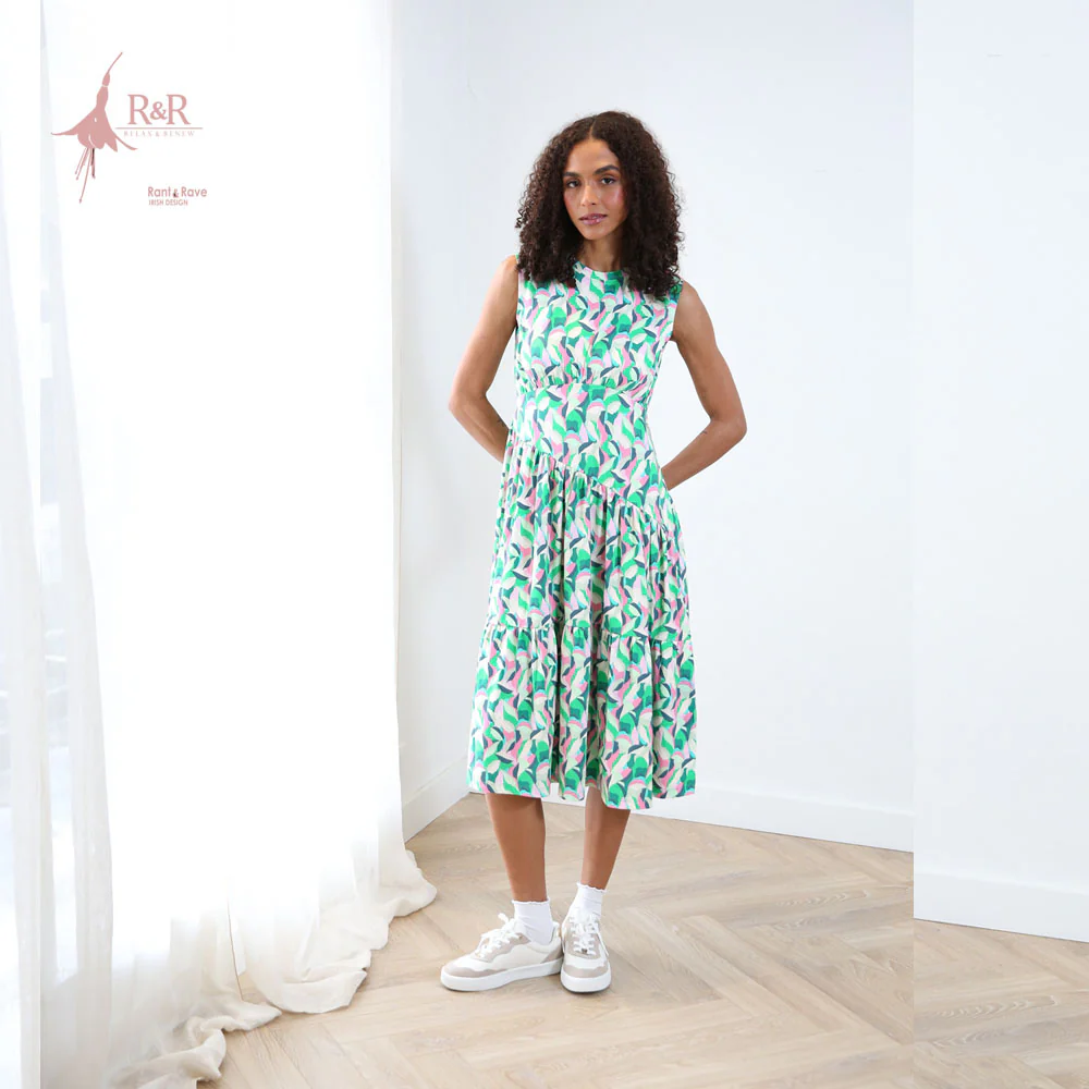 Featuring a round neckline, gently fitted waist and tiered skirt, the Effie Dress flows beautifully while remaining easy to wear. The vibrant multi-colour abstract print brings a fresh, uplifting feel, making it perfect for holidays, summer days or casual occasions.